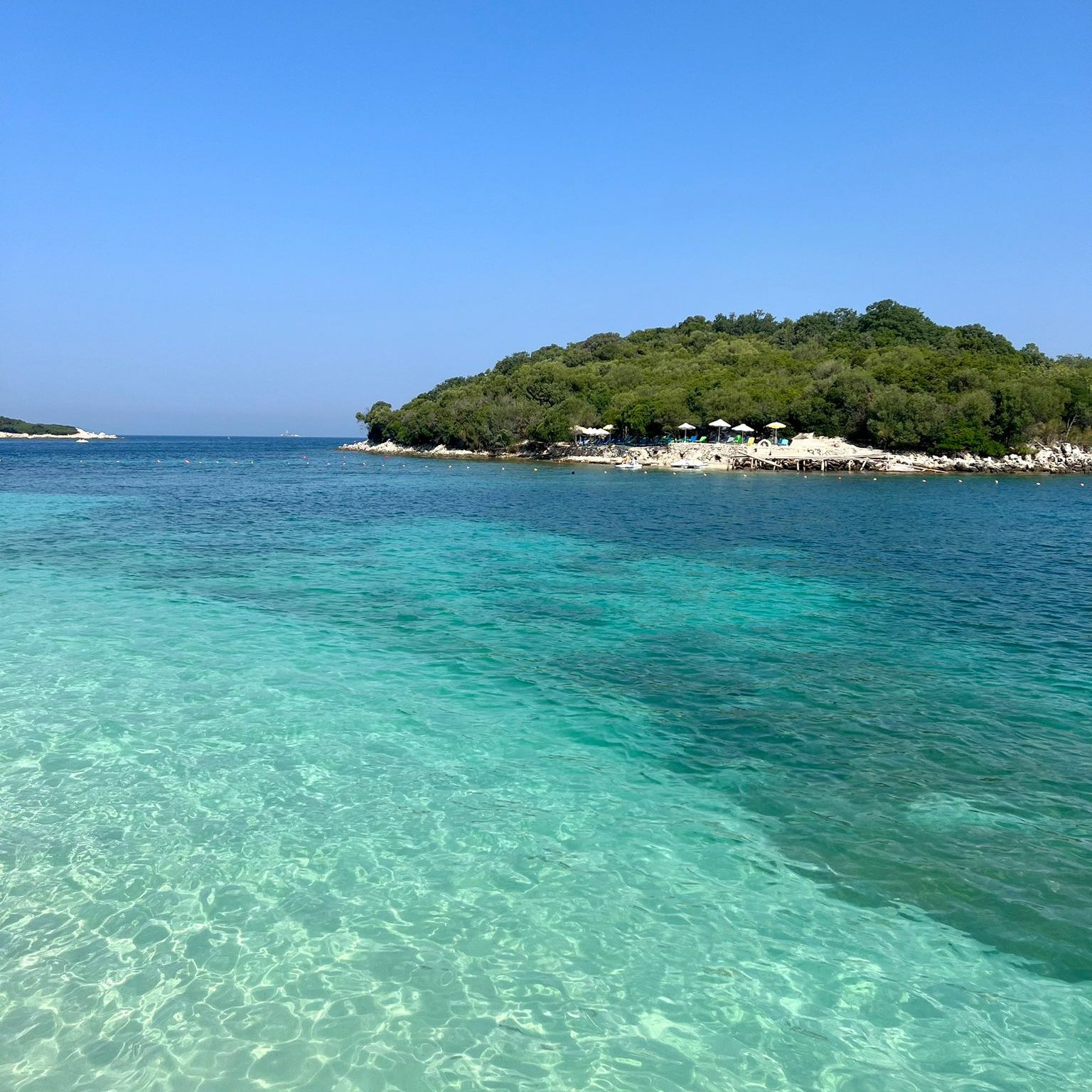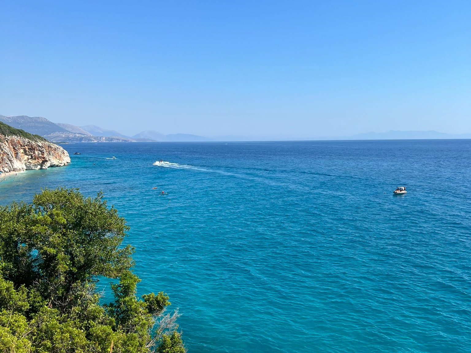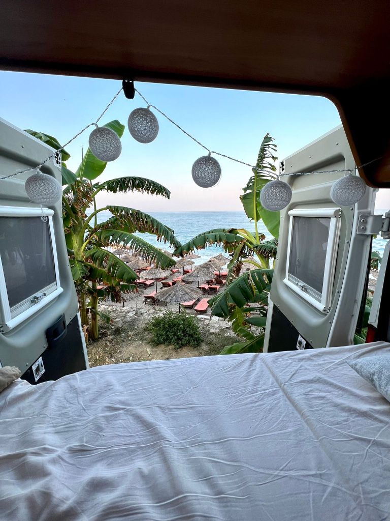 Giorno 6-7 – Vorremmo stare a Lukove ma becchiamo una giornata di mare discretamente mosso perciò dopo qualche ora di spiaggia, sistemiamo il camper e partiamo direzione Ksamil. Sappiamo che la località è già super turistica e in agosto molto affollata, le previsioni non mentono ma il mare merita assolutamente una visita. Troviamo posto allo Ksamil caravan camping, ombreggiato per van e piccoli mezzi mentre i mezzi più grandi non hanno ombra. Linda e il marito offrono caffè freddo e biscotti agli ospiti appena arrivati e accolgono tutti come a casa. I servizi sono pulitissimi, cucina e frigo di libero utilizzo. Una chicca nella confusione di Ksamil , un luogo dove incontrare altri viaggiatori e condividere le proprie esperienza. Nelle vicinanze spiaggia rocciosa mentre attraverso una pista ciclopedonale si può arrivare allege del centro di Ksamil. Abbiamo preso un ombrellone e due lettini perché non c’è possibilità di spiaggia libera, il costo è di 25€. Molto sopra la media albanese (8-10€) ma Ksamil è comunque uno dei luoghi che più sta subendo il turismo di massa e l’aumento dei prezzi in questo genere di località esiste. Ci auguriamo riescano a preservare un territorio magnifico e unico. Dalla spiaggia si può nuotare fino le 3 isole di Ksamil o prendere uno dei tanti mezzi acquatici che fanno la spola tra la costa e le isolette.
