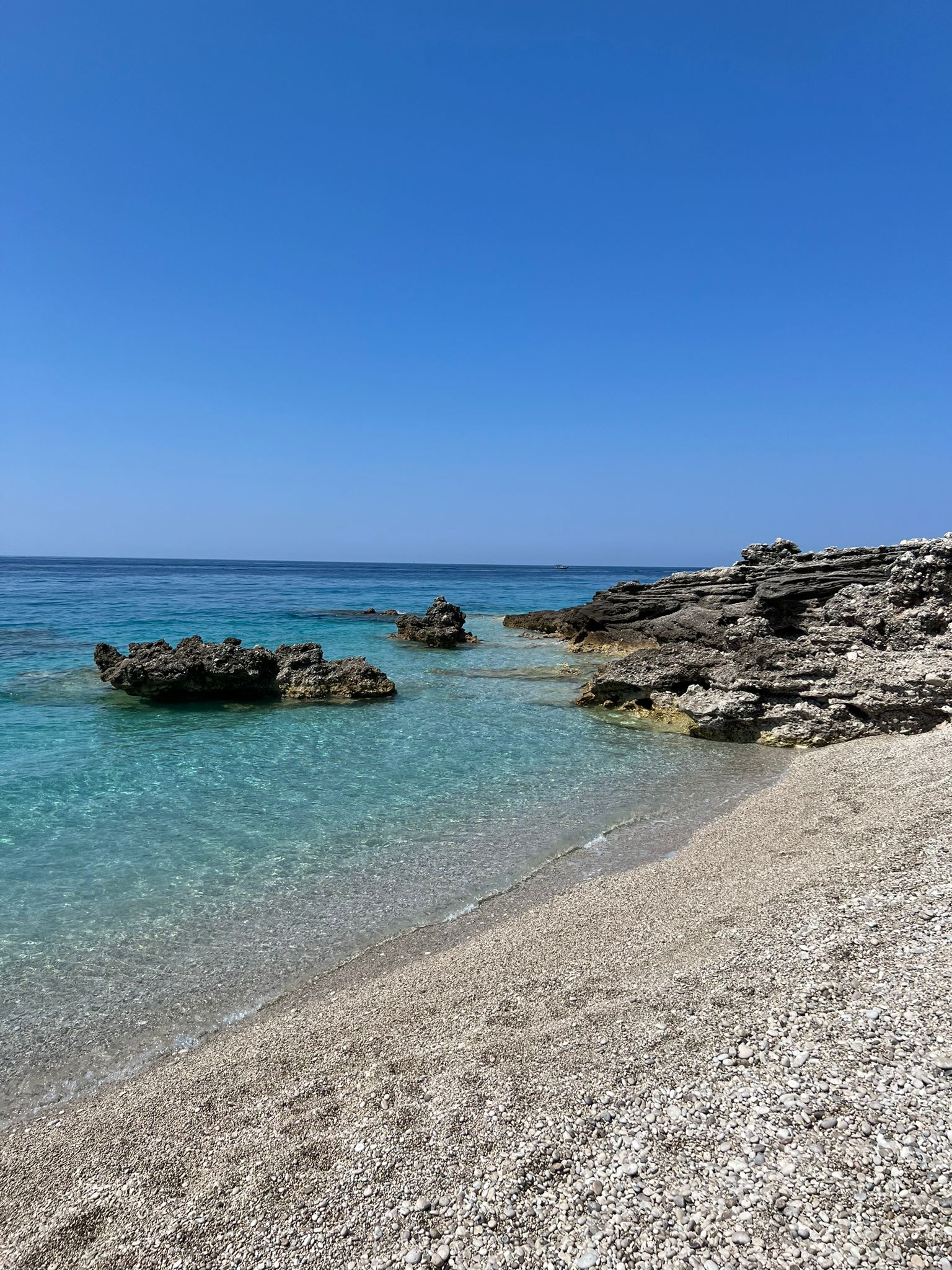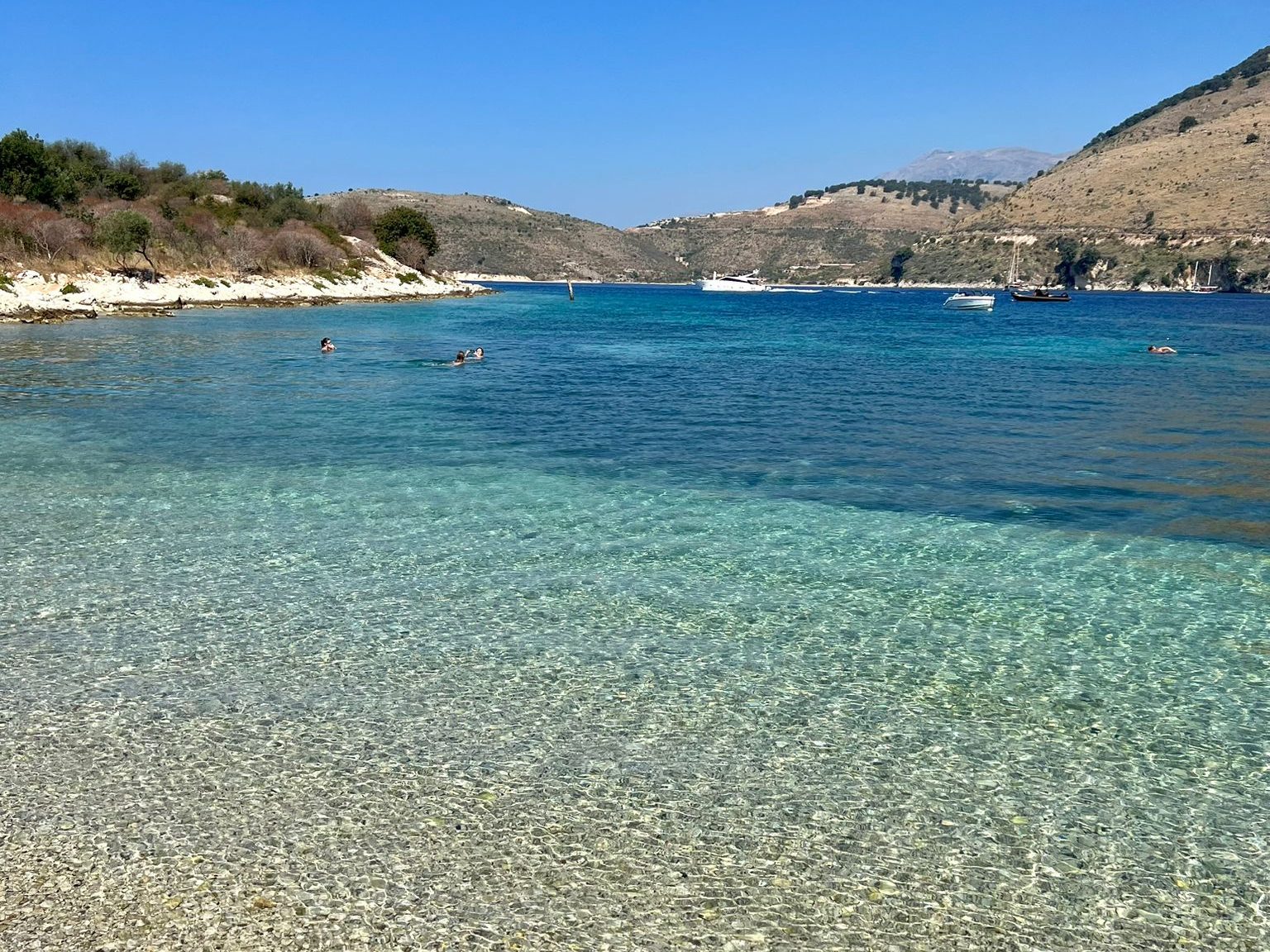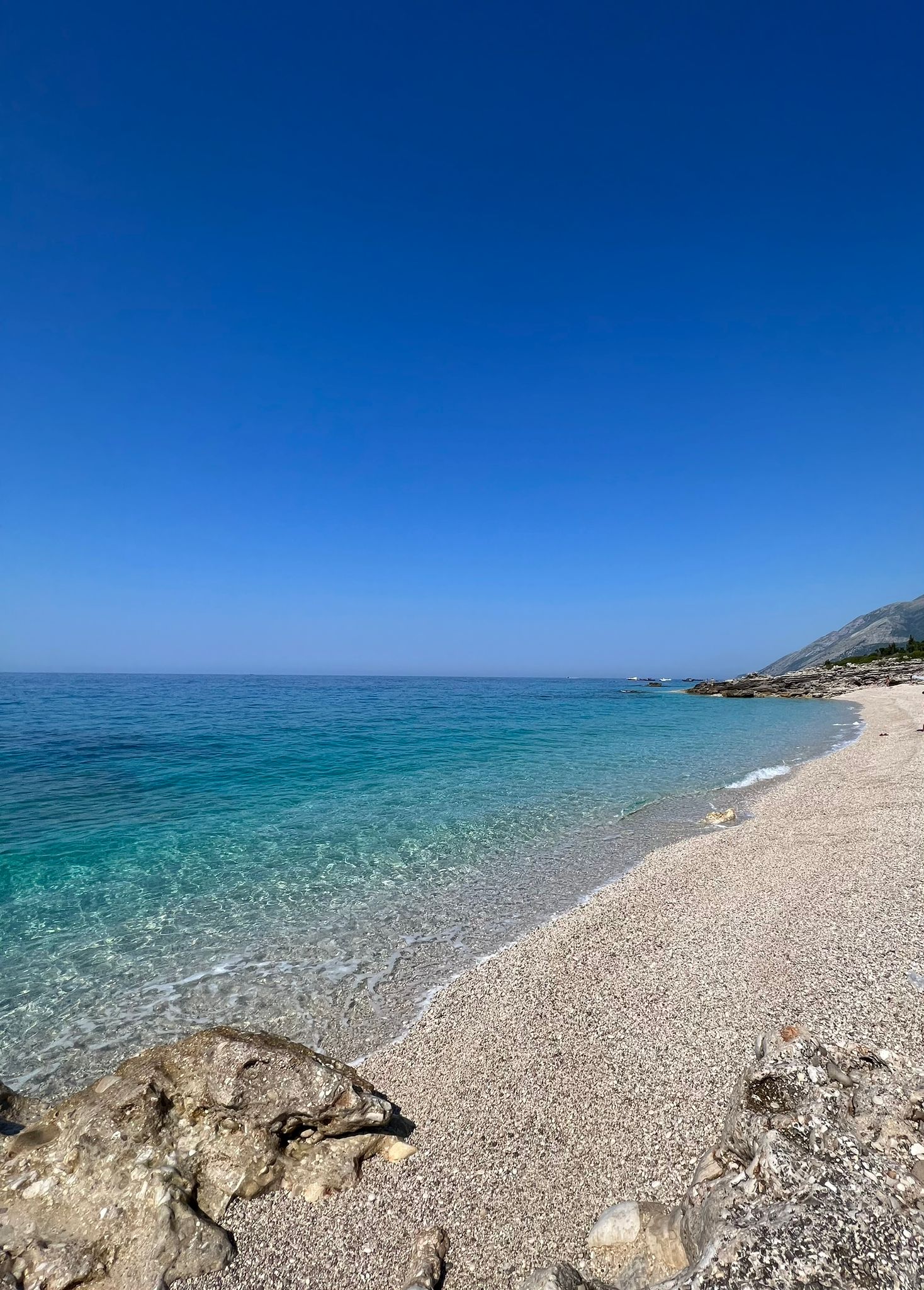 Giorno 6-7 – Vorremmo stare a Lukove ma becchiamo una giornata di mare discretamente mosso perciò dopo qualche ora di spiaggia, sistemiamo il camper e partiamo direzione Ksamil. Sappiamo che la località è già super turistica e in agosto molto affollata, le previsioni non mentono ma il mare merita assolutamente una visita. Troviamo posto allo Ksamil caravan camping, ombreggiato per van e piccoli mezzi mentre i mezzi più grandi non hanno ombra. Linda e il marito offrono caffè freddo e biscotti agli ospiti appena arrivati e accolgono tutti come a casa. I servizi sono pulitissimi, cucina e frigo di libero utilizzo. Una chicca nella confusione di Ksamil , un luogo dove incontrare altri viaggiatori e condividere le proprie esperienza. Nelle vicinanze spiaggia rocciosa mentre attraverso una pista ciclopedonale si può arrivare allege del centro di Ksamil. Abbiamo preso un ombrellone e due lettini perché non c’è possibilità di spiaggia libera, il costo è di 25€. Molto sopra la media albanese (8-10€) ma Ksamil è comunque uno dei luoghi che più sta subendo il turismo di massa e l’aumento dei prezzi in questo genere di località esiste. Ci auguriamo riescano a preservare un territorio magnifico e unico. Dalla spiaggia si può nuotare fino le 3 isole di Ksamil o prendere uno dei tanti mezzi acquatici che fanno la spola tra la costa e le isolette.